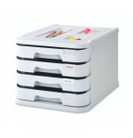 En poliestireno. Modulo con cuatro cajones de 5 cm. para guardar documentos, con sistema de bloqueo, que evita la salida de los mismos. Con portaetiquetas en cada cajon. Disenado para poder apilarse de forma vertical formando un solido bloque. Exterior gris. Con dos tapas decorativas. Medidas exteriores: 28,5?37,5?23 cm.
