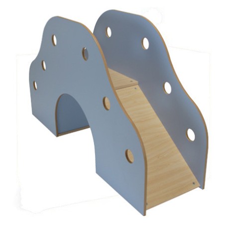 Estructura formada por escalera, plataforma y rampa, con paso inferior tipo tunel. Fabricado en melamina de haya, con tableros de 19 mm de espesor y cantos de PVC de 2 mm. Costados en DM melaminizado de 16 mm de grosor con cantos redondeados y barnizados con barniz no toxico.Garantizado por los ensayos realizados en centro tecnologico de certificacion de mobiliario TECNALIA.