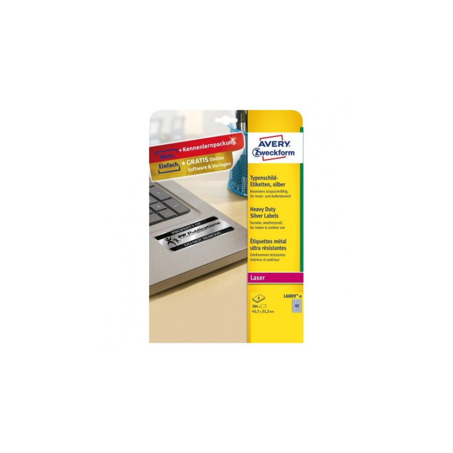Avery L6009-8. Color del producto: Plata, Tipo de etiqueta: Etiqueta para impresora autoadhesiva, Formato: A4. Anchura de etiqueta: 4,57 cm, Altura de etiqueta: 2,12 cm. Etiquetas por paquete: 384 pieza(s), Hojas de medios por paquete: 8 hojas