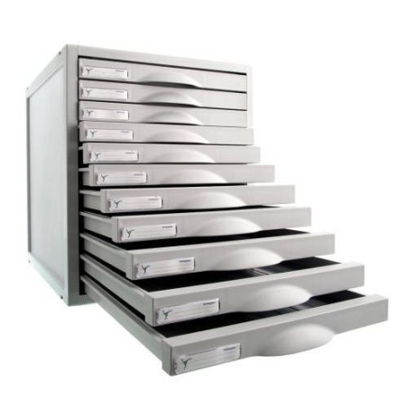 Modulo de 11 cajones. 12 cajones de suave deslizamiento y tope de seguridad. 11 cajones de 22 mm. Medidas interiores de los cajones de 22mm: 322 x 265 x 22 mm (fondo x ancho x alto). Incluye tarjetero identificador en todos los cajones.