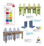 Mesa trona compuesta por una encimera en forma de arco fabricada en tablero MDF (DM) de 21 mm de espesor, con cantos redondeados barnizados con barniz no toxico. Superficie y contratiro de la encimera laminados con planchas de alta presion (HPL), muy resistentes al desgaste. Dos costados y cinco respaldos que ejercen la funcion de patas, fabricados en MDF (DM) de 16 mm de espesor, con cantos redondeados y barnizados con barniz no toxico, incorporan ruedas en sus extremos inferiores para facilitar su desplazamiento. Cinco bases para asientos con una barra de seguridad central para que no se caigan los ninos/as. Opcion de incorporar asientos acolchados con funda extraible de facil limpieza, disponibles en nuestra web (referencia 1336123)Encimera a 76 cm. de altura.Los respaldos estan personalizados con caras que expresan diferentes emociones.Integramente desmontable, reduciendo asi el impacto ambiental en su transporte.Garantizado por los ensayos realizados en centro tecnologico de certificacion de mobiliario TECNALIA.